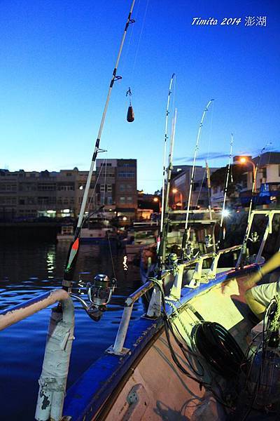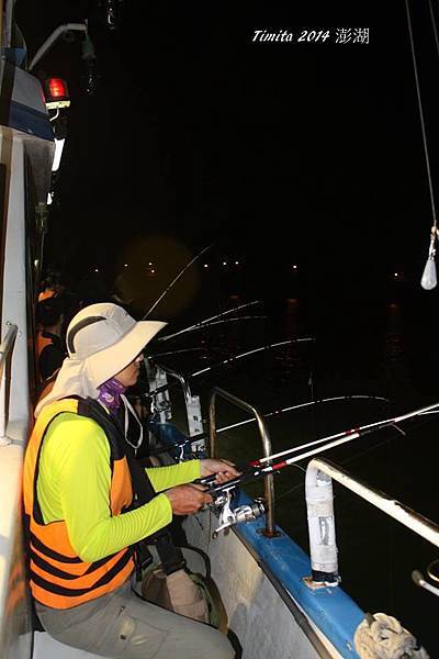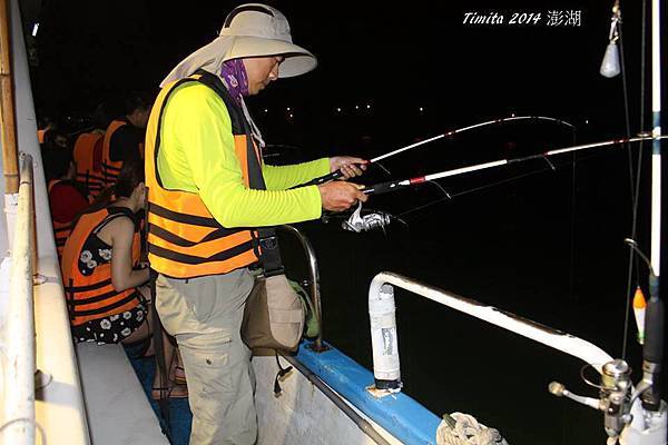 等到船開到一定的位置之後,船長會把船固定,放下魚燈,然後開始廣播教大家怎麼使用魚竿