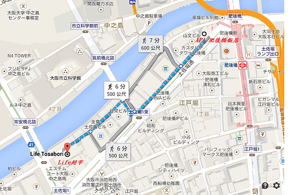 從APA肥後橋飯店順著土佐堀通一直走,之後就會看到Life超市唷!!!在右手邊方向
