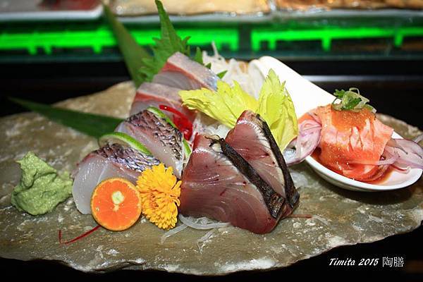 綜合刺身(當日新鮮魚種),陶膳擺盤相當講究,用天然石頭當器皿,讓這道刺身更有視覺上的美感,加分不少啊!!!以下Timita還沒吃下去前,先把新鮮sashimi放在盤子上特寫拍一張一一介紹這道生魚片的魚種及口感吧^^~ 感謝阿水師傅介紹唷!!!又讓Timita增加知識了^^~不再只是吃而已 哈哈哈