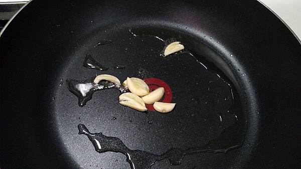 冷鍋冷油放蒜頭片,讓油有蒜頭的香氣。