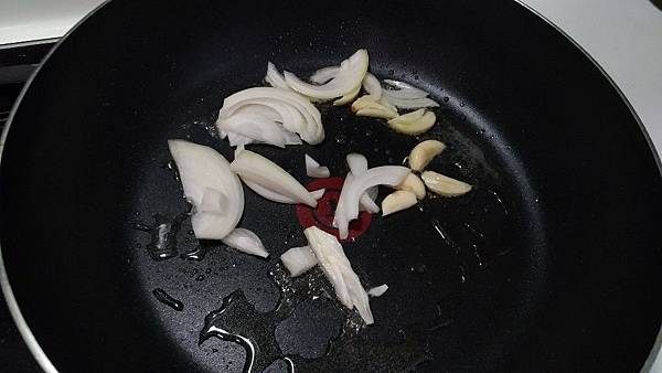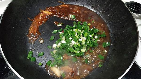 倒入一些水,約0.5公分高度,在倒入2大匙醬油,半大匙味淋,如果有吃辣,可以加辣椒。