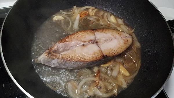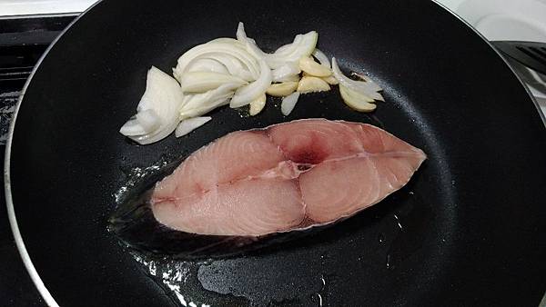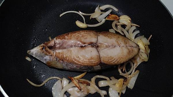 小火在把土魠魚雙面煎至金黃,蒜頭與洋蔥旁邊拌炒。