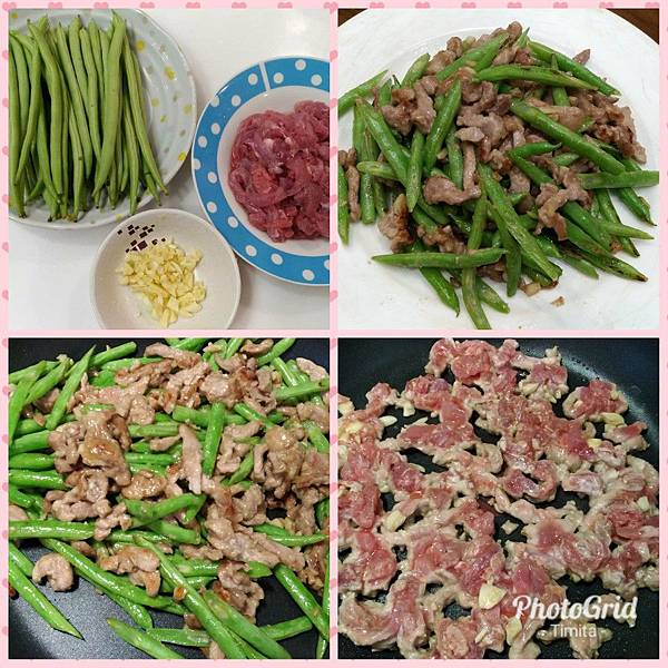 大火炒時,加入少許的水,使之更快熟,待四季豆顏色改變後,更翠綠時,把之前炒好的肉絲也放入一起拌炒。