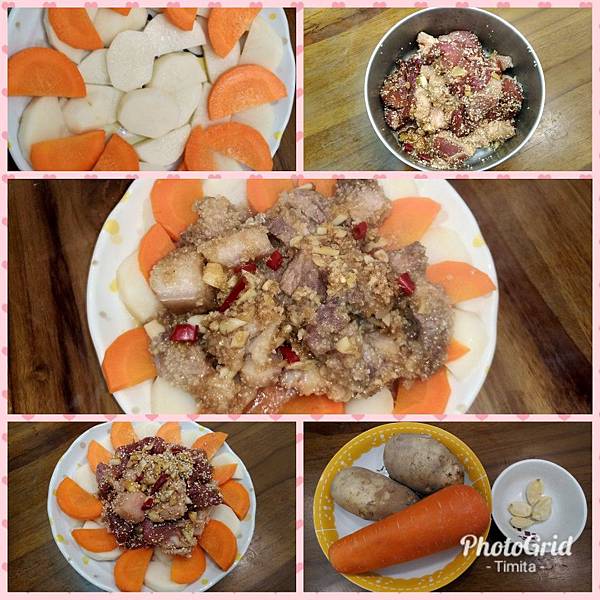有媽媽味道的粉蒸肉上菜囉,肉汁整個被馬鈴薯與紅蘿蔔吸收,配白飯超級下飯的,好好吃啊,大家也可以試試這道菜唷。